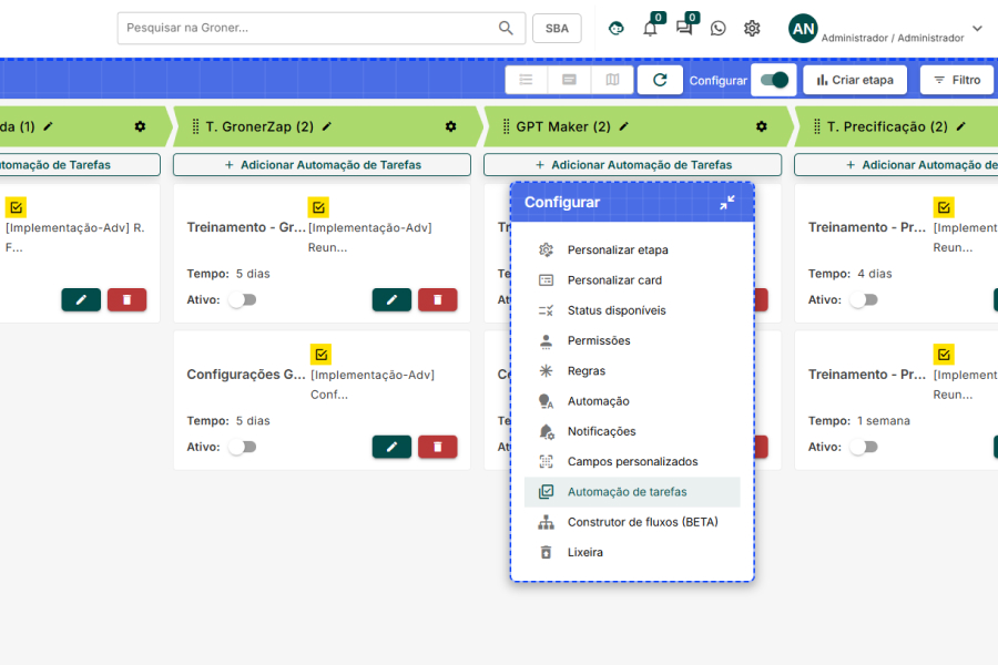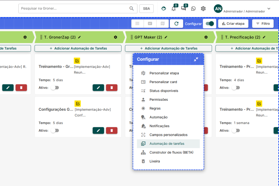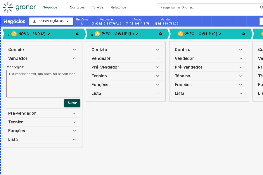 A cada mudança de etapa no funil, a Groner dispara automaticamente as tarefas certas. Você garante consistência na execução e evita falhas operacionais.