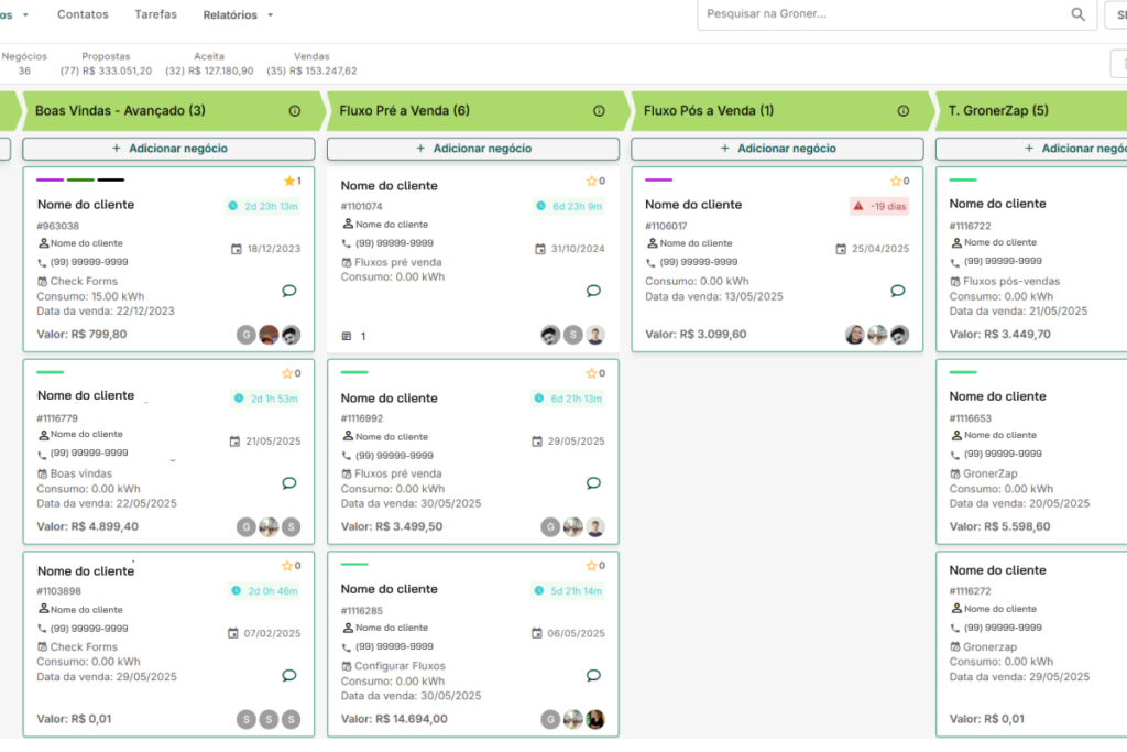 Acompanhe todo o percurso de cada projeto com registros detalhados, desde a entrada do lead até a conclusão da instalação.