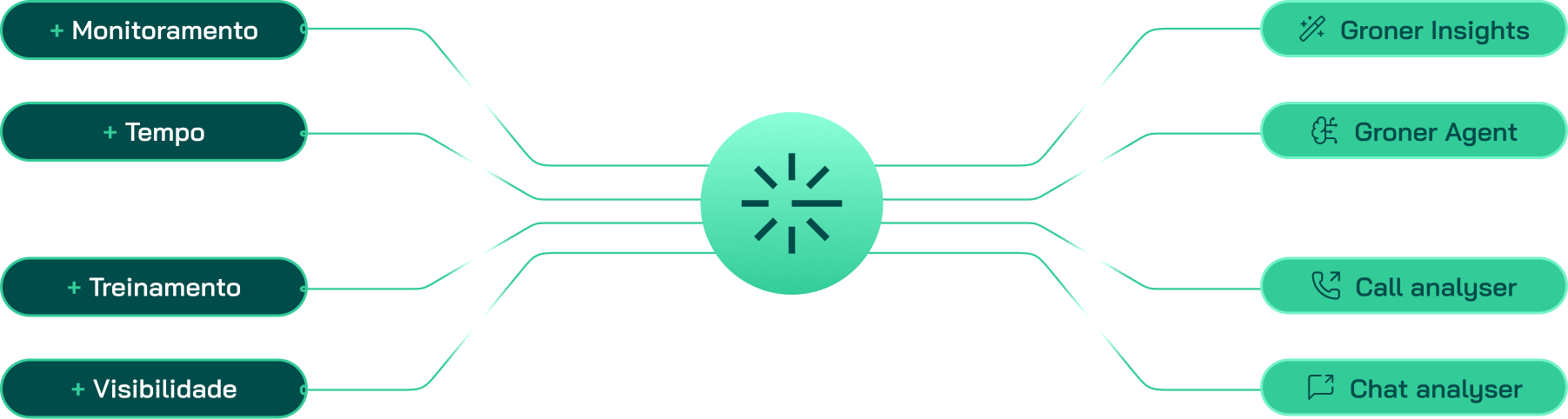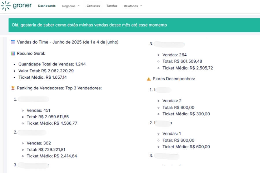 O Groner AI interpreta todos os dados, do atendimento à perda de vendas e te mostra, de forma simples, o que está travando o crescimento da sua empresa.